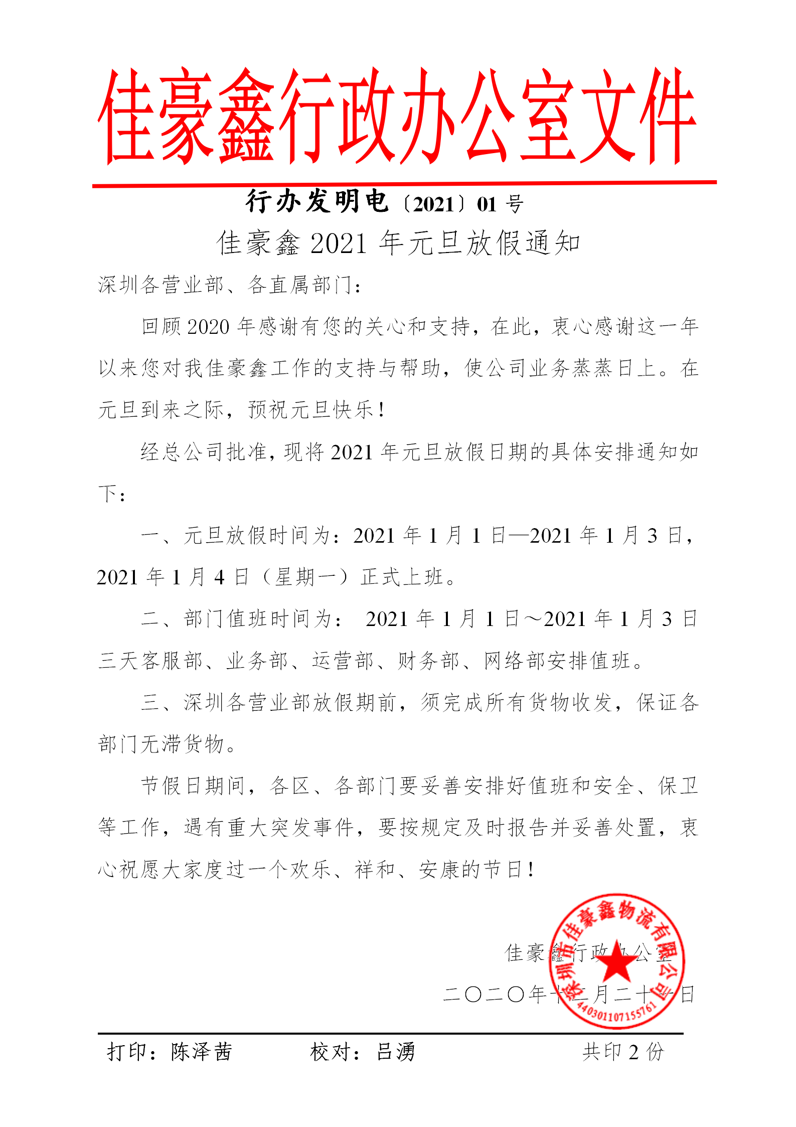 佳豪鑫2021年元旦放假通知