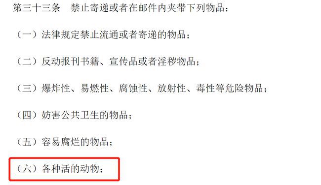 但是,根據《郵政法》相關(guān)規定,是明令禁止郵寄運輸活體動(dòng)物。(除特殊運輸外,如具備相關(guān)證明的航運是允許運輸的。)
